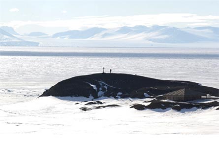 What you're seeing here is Scott's hut in the lower right, Vince's cross atop the little hillock, and the Royal Society range in the background. There's also a mighty large glacier pouring from between the mountains into the McMurdo sound and a person standing on the hill with Vince's cross. A lot of people go up there and just stand for a while. It's kind of like being in a church, or standing near a consecrated site. I'm not sure what you'd think if you were standing there, but what I thought was that life was great. How lucky I was to be standing where so few people could ever hope to go. I wondered why me; why did I get to go and not so many others who want to.