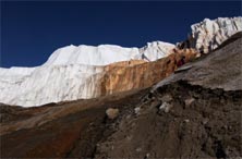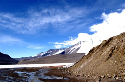 Let's walk. Come on the walk past Blood Falls. Walk with friends in the Antarctic Veldt. Life is different here. Here is where life searches to find its place and uncovers only frigid niches. Most places in the universe are uninhabitable by living creatures, and Antarctica is among them. It's nearly as uninhabitable as Venus, Mars, or the Orion Nebula. Creatures made of flesh and bone have only one fate--to leave or become part of the fossilzed record someone will find thousands of years from now. Here only the rocks are alive. The ice breathes and moves. Sit next to a wall of moving ice and boulders and listen to what she has to tell you. Your feet crunch on the sand and once in a while you step on a large stone and your foot twists awkwardly and you stumble. The rock you just saw fall from the glacer side into the melt water was embedded in ice when the pyramids were built.